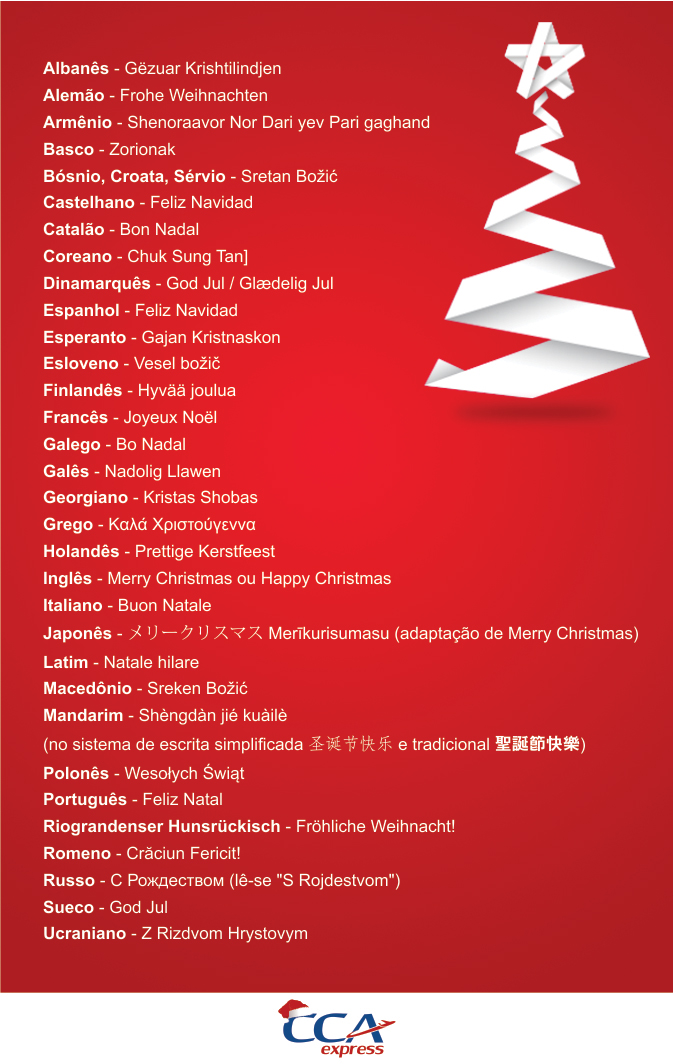 Desejamos felicidades a todos que nos acompanham e aos queridos clientes, nossos sinceros agradecimentos. E como o Natal é uma data comemorada praticamente no mundo todo, deixamos um “Feliz Natal” em vários idiomas para vocês: